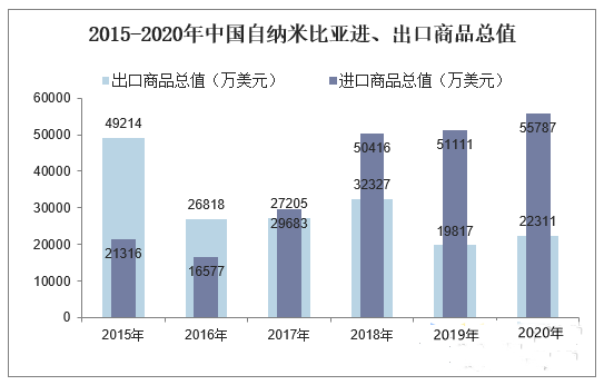 2015-2020年中国与纳米比亚双边货物进出口额